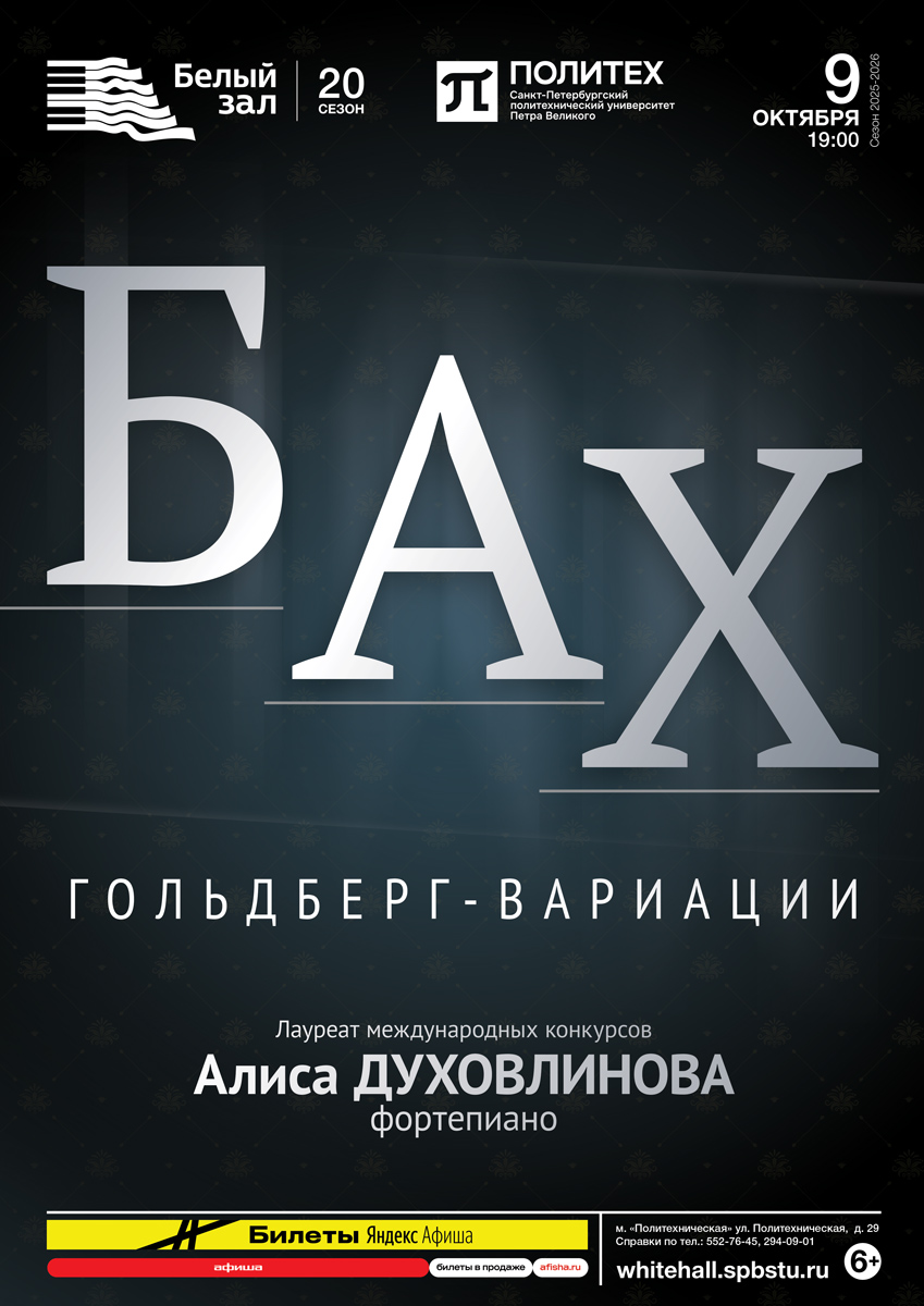 Концерт-приношение к 340-летию И.С. Баха представляет Алиса Духовлинова — ученица Олега Вайнштейна и Татьяны Загоровской. Является лауреатом международных конкурсов, имеет сертификат высшего исполнительского мастерства Internetional Academy of Music, является стипендиатом Richard-Wagner-Stipendienstiftung.