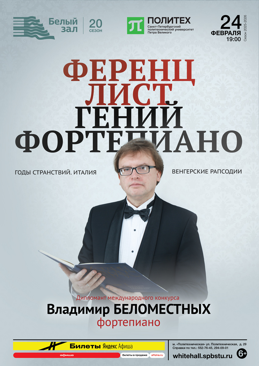 Сонеты Петрарки, цикл «Годы странствий. Италия», Соната по прочтении Данте, Венгерские рапсодии — музыку, полную страсти и нежности, драматизма и эмоциональных контрастов исполнит Владимир Беломестных.