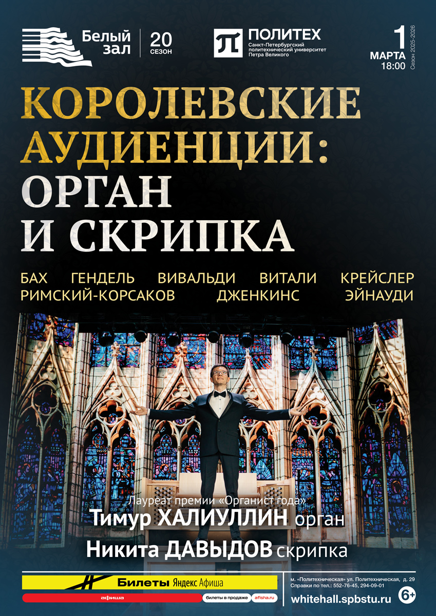 Орган называют Королем инструментов, а скрипку — Королевой оркестра! Тимур Халиуллин и Никита Давыдов распахнут двери королевского дворца, и каждый слушатель станет почетным гостем. В дворцовых интерьерах Белого зала оживут истории королей и королев, принцев и принцесс, царей и цариц, владык и владычиц.