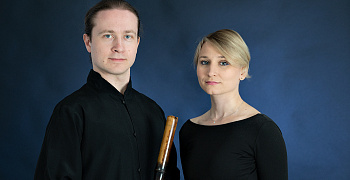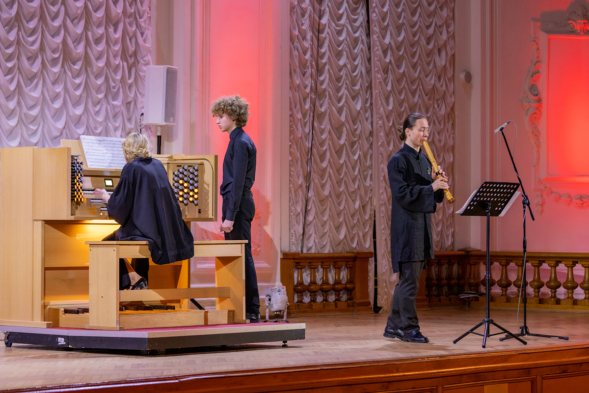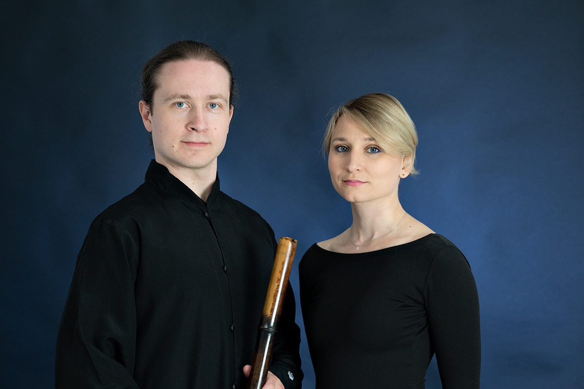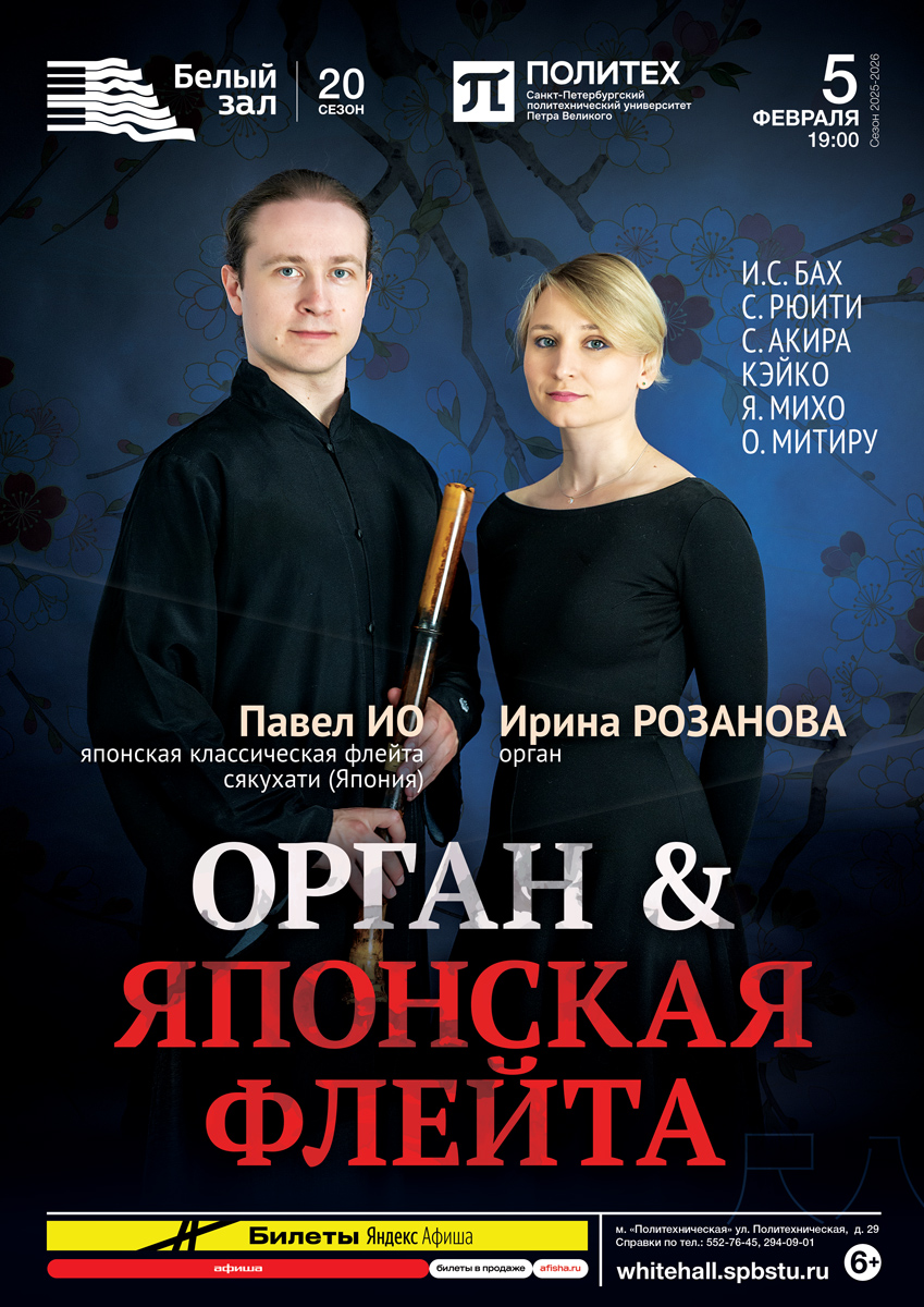 На сцене — победитель конкурсов японской классической музыки, выпускник Токийского университета искусств Павел Ио и одна из лучших современных российских органисток Ирина Розанова.