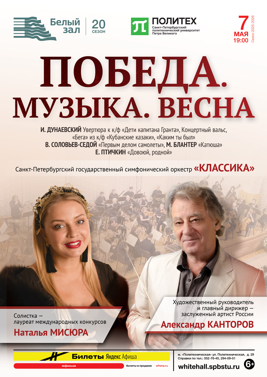 Санкт-Петербургский государственный симфонический оркестр «Классика» исполнит киношедевры Исаака Дунаевского — яркую Увертюра к фильму «Дети капитана Гранта» и темпераментные «Бега» из кинофильма «Кубанские казаки».