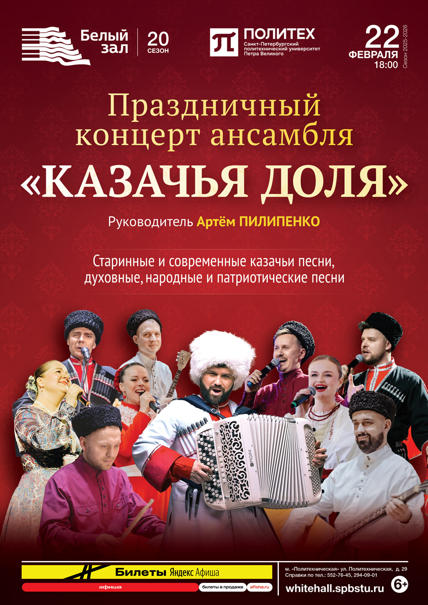 «Казачья доля» под руководством Артема Пилипенко исполнит казачьи песни, среди которых любимые и знакомые всем — «Ой, то не вечер», «Доля, моя доля», «Ой, при лужку» и многие другие.
