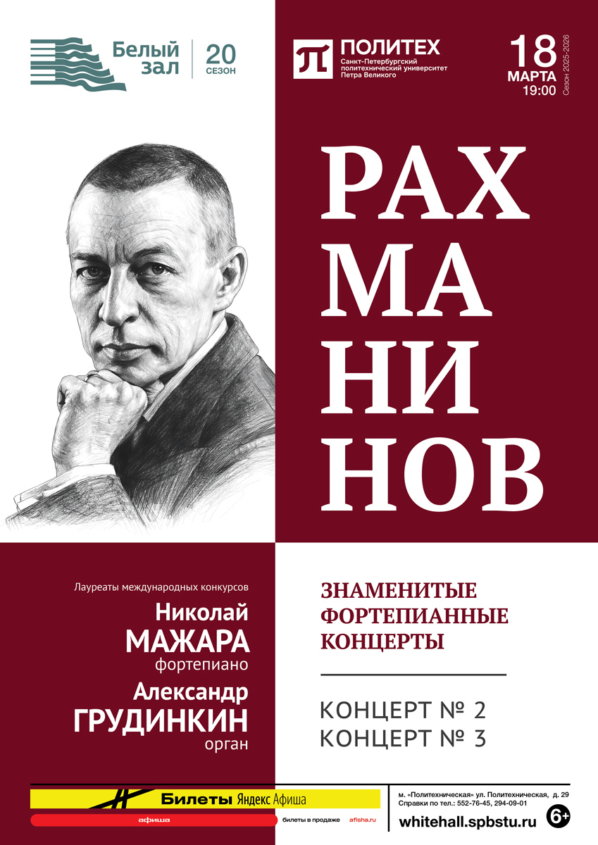 Концерт № 2 — одно из самых узнаваемых и эмоционально насыщенных произведений мировой музыкальной классики — прозвучит в транскрипции партии оркестра для органа. Орган, обладая колоссальным тембровым и динамическим диапазоном, сохранит масштаб партитуры, подчеркнет монументальность кульминаций и глубину лирических эпизодов. Фортепианная партия, освобожденная от плотной оркестровой массы, прозвучит более исповедально, камерно и в то же время драматически напряженно.