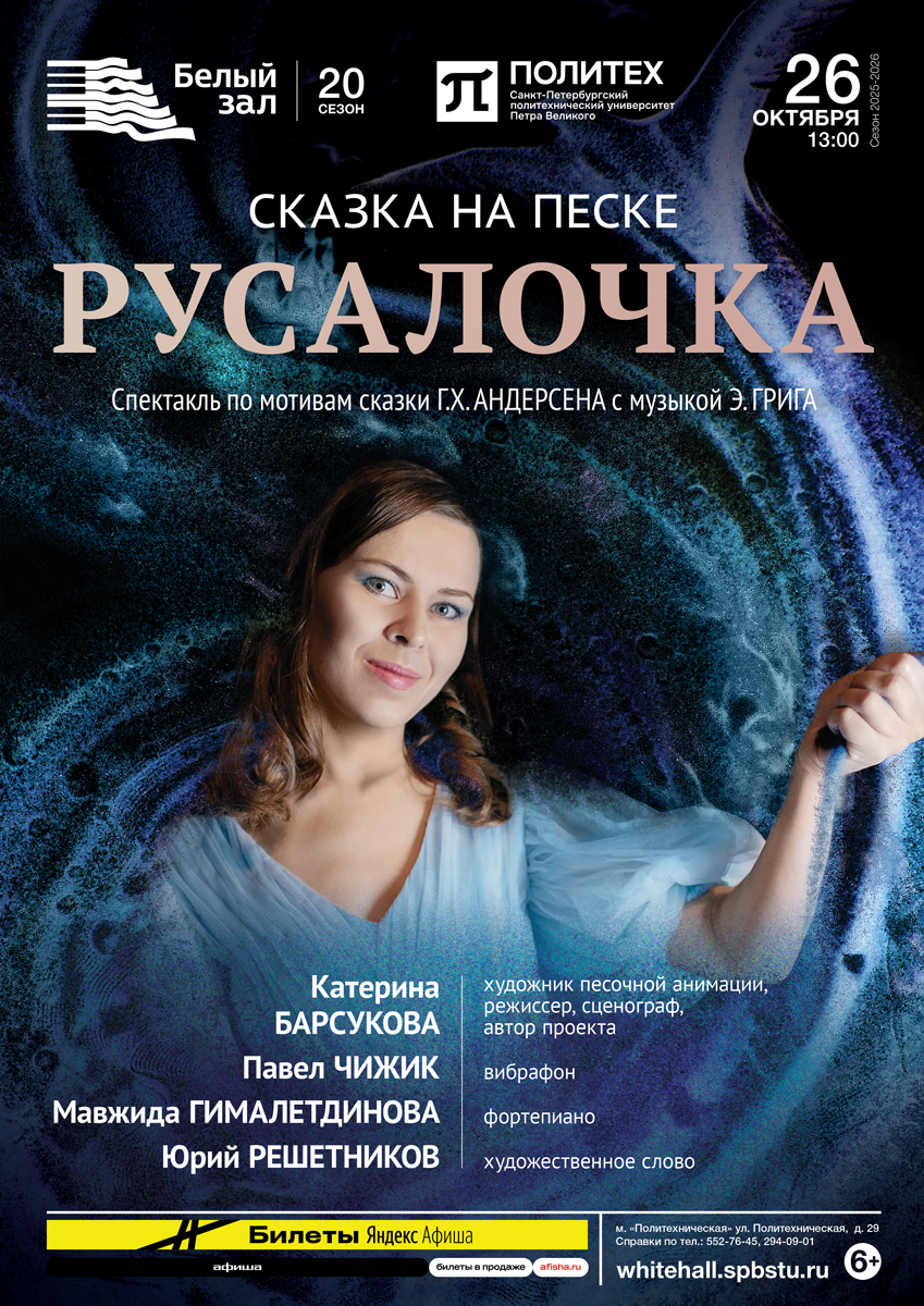 Спектакль «Русалочка» поведает историю о жертвенной любви главной героини, которая лишается голоса и морской жизни ради любви. Погружение в сказку произойдет не только через песочную анимацию в морских колоритах и театр теней, но и с помощью необычного музыкального инструмента. Вибрафон с его кристально чистым звучанием, перламутровыми обертонами словно создан, чтобы передать дыхание морских глубин и хрупкость души Русалки.
